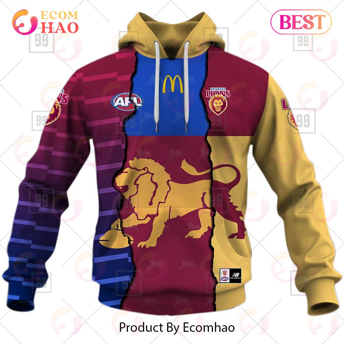 Product Features Along with its Brisbane Lions Guernsey graphics, this cozy pullover hoodie features super-soft midweight material. Healthy fabric 100% polyester with milk silk inner fabric. The fabric is durable and resistant to wrinkles, shrinking and mildew. Hood with drawstrings. Long sleeve. Front pouch pocket. Midweight hoodie suitable for moderate temperatures. Features a specialty high...