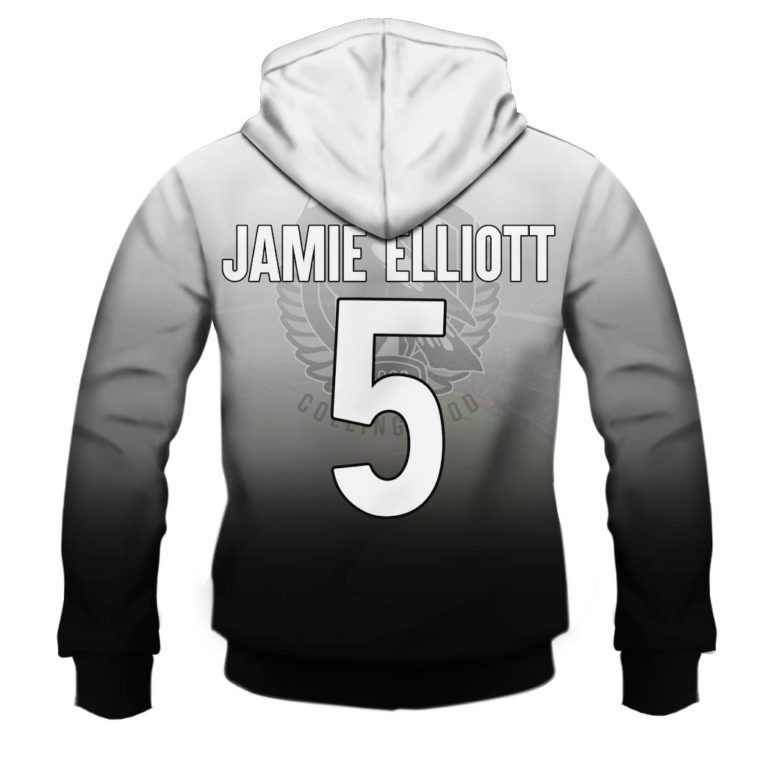AFL Collingwood Magpies Jamie Elliott #5 Pullover Hoodie Product Features Along with its Collingwood Magpies graphics, this cozy pullover hoodie features super-soft midweight material. Material: 95% polyester + 5% spandex. The fabric is durable and resistant to wrinkles, shrinking and mildew. Hood with drawstrings. Long sleeve. Front pouch pocket. Midweight hoodie suitable for moderate temperatures....