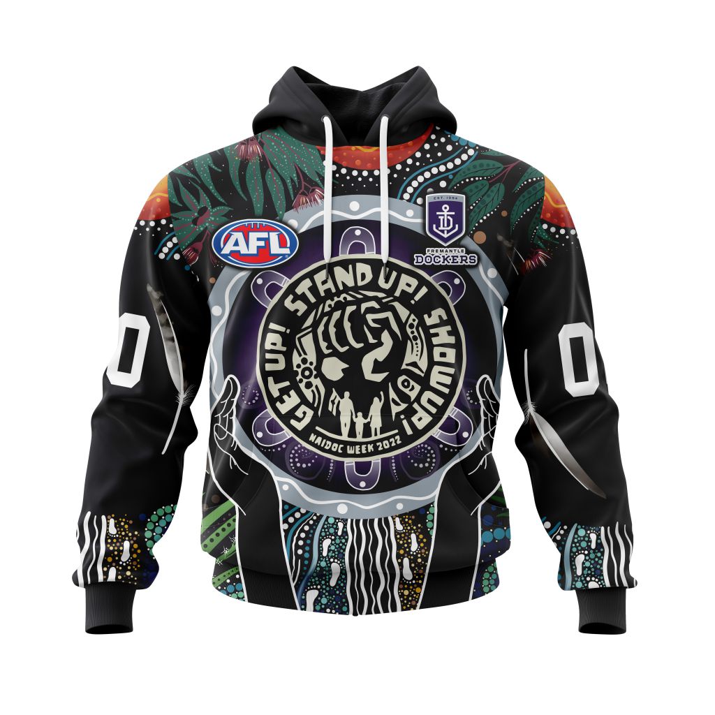 AFL Fremantle Dockers Custom Name Number Concepts For NAIDOC Event Pullover Hoodie Product Features Along with its Fremantle Dockers graphics, this cozy pullover hoodie features super-soft midweight material. Material: 95% polyester + 5% spandex. The fabric is durable and resistant to wrinkles, shrinking and mildew. Hood with drawstrings. Long sleeve. Front pouch pocket. Midweight hoodie...