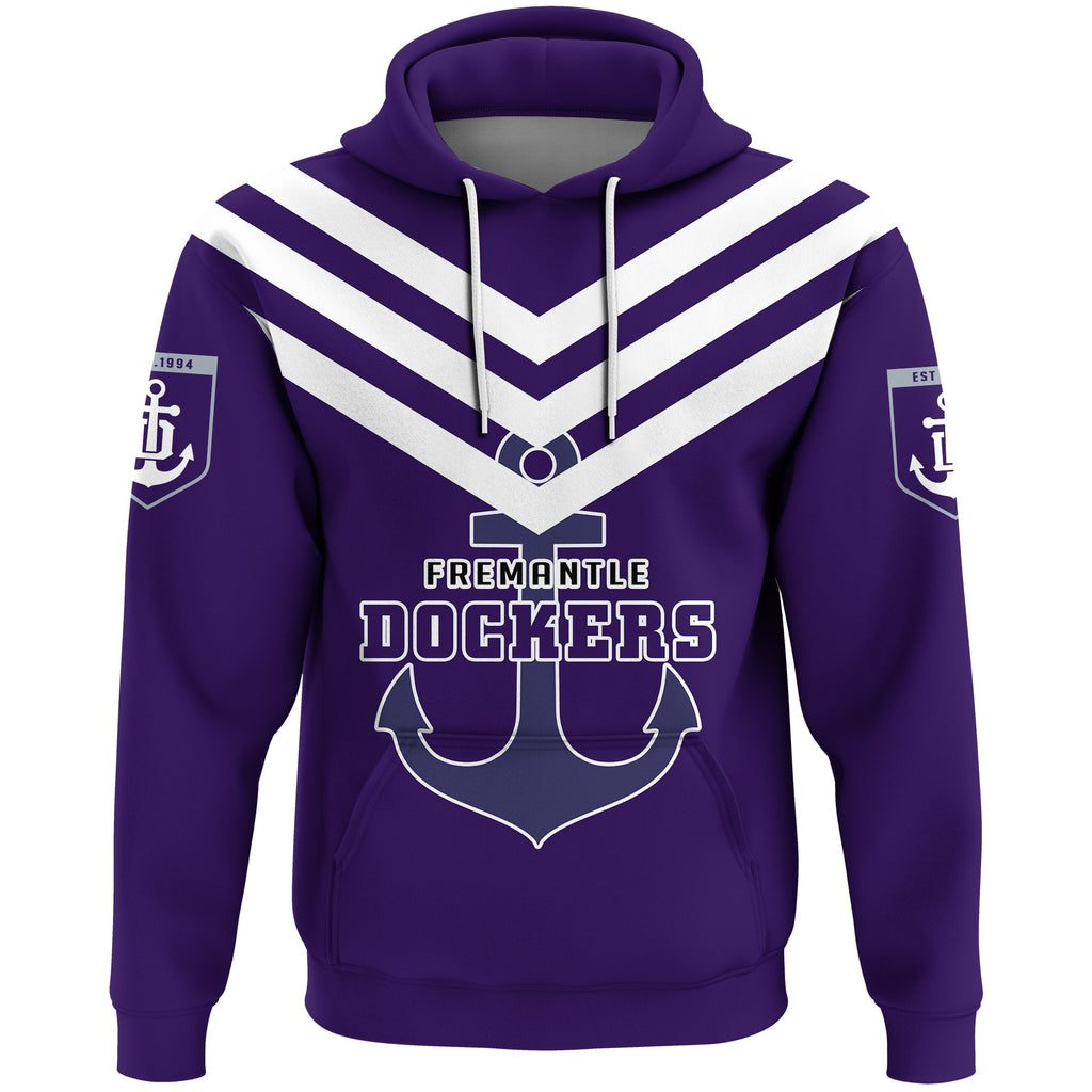 AFL Fremantle Dockers Original Uni Pullover Hoodie Product Features Along with its Fremantle Dockers graphics, this cozy pullover hoodie features super-soft midweight material. Material: 95% polyester + 5% spandex. The fabric is durable and resistant to wrinkles, shrinking and mildew. Hood with drawstrings. Long sleeve. Front pouch pocket. Midweight hoodie suitable for moderate temperatures. Features...