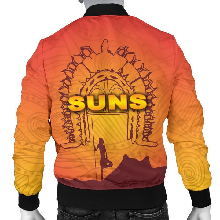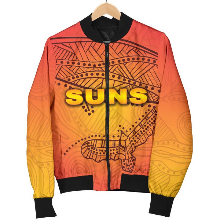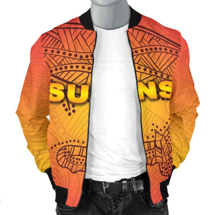 AFL Gold Coast Suns Simple Indigenous Bomber Jacket Product Features This sweet bomber jacket features crisp Gold Coast Suns graphics that put your fandom proudly on display, so no one will be able to question your allegiance. Always on-trend: Matches seamlessly with anything underneath ? definitely a wardrobe staple. Comfy & warm: With ample lining...