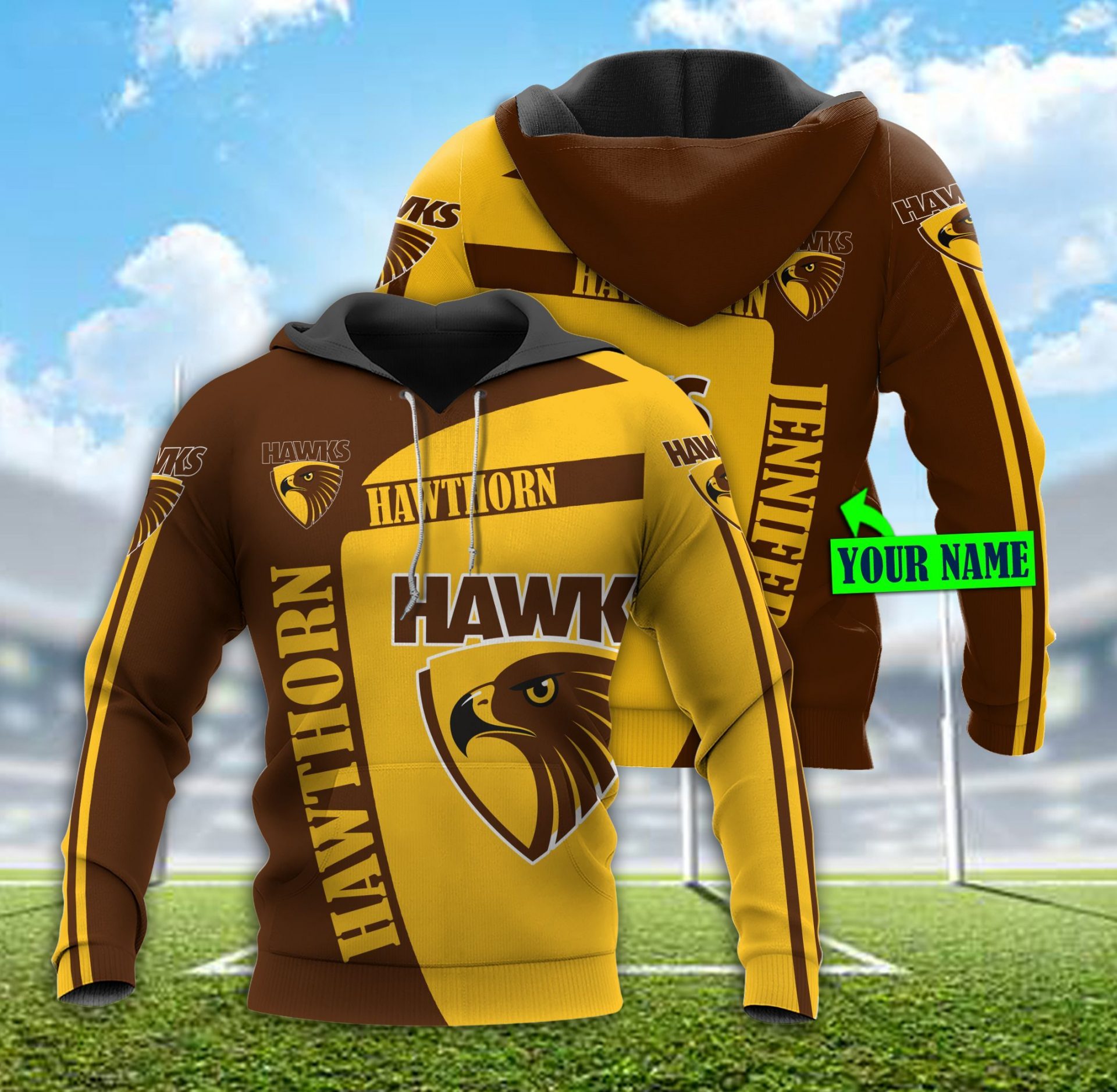 AFL Hawthorn Hawks Custom Name Brown Gold Pullover Hoodie Product Features Along with its Hawthorn Hawks graphics, this cozy pullover hoodie features super-soft midweight material. Material: 95% polyester + 5% spandex. The fabric is durable and resistant to wrinkles, shrinking and mildew. Hood with drawstrings. Long sleeve. Front pouch pocket. Midweight hoodie suitable for moderate...