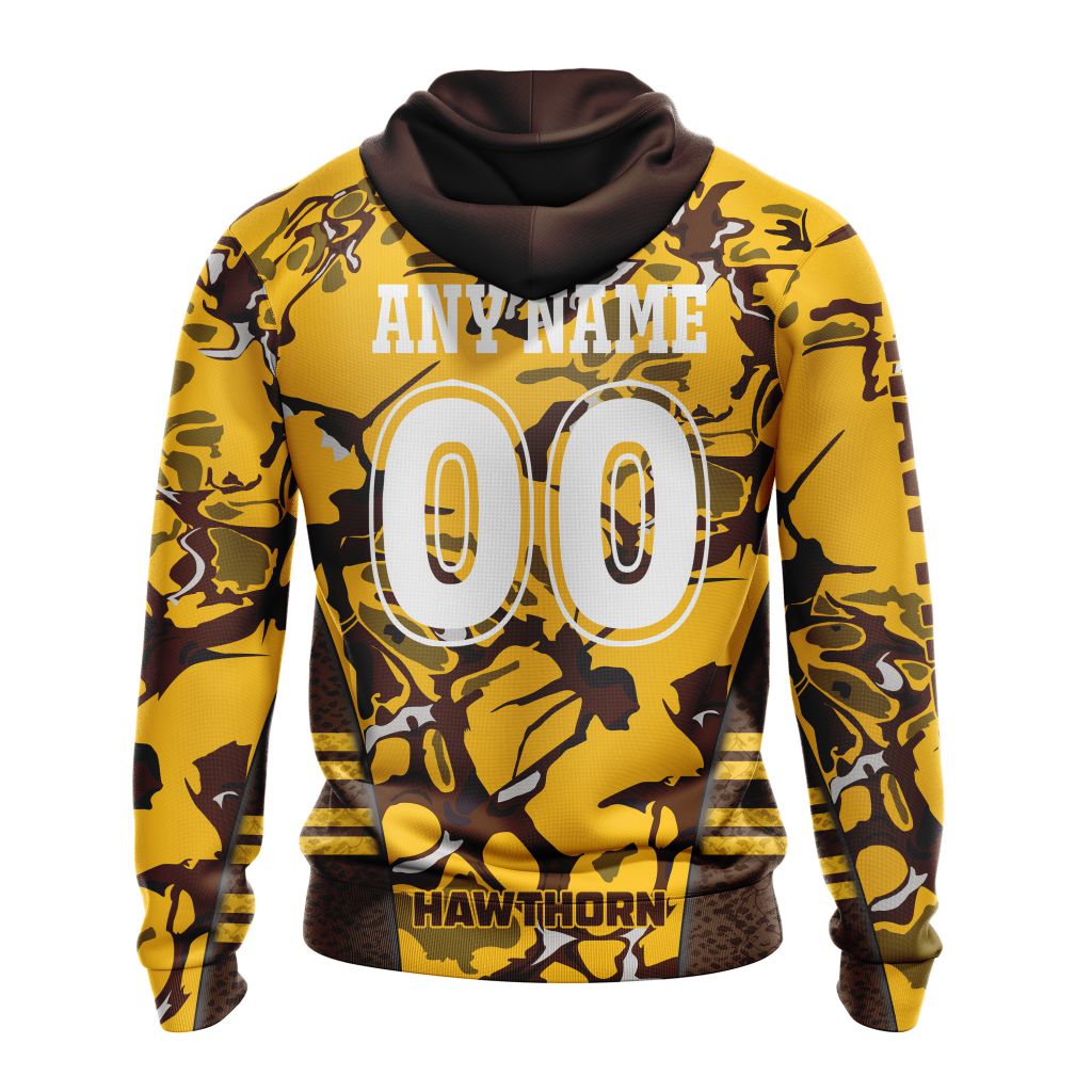 AFL Hawthorn Hawks Custom Name Number Camo Morden Art Style Pullover Hoodie Product Features Along with its Hawthorn Hawks graphics, this cozy pullover hoodie features super-soft midweight material. Material: 95% polyester + 5% spandex. The fabric is durable and resistant to wrinkles, shrinking and mildew. Hood with drawstrings. Long sleeve. Front pouch pocket. Midweight hoodie...