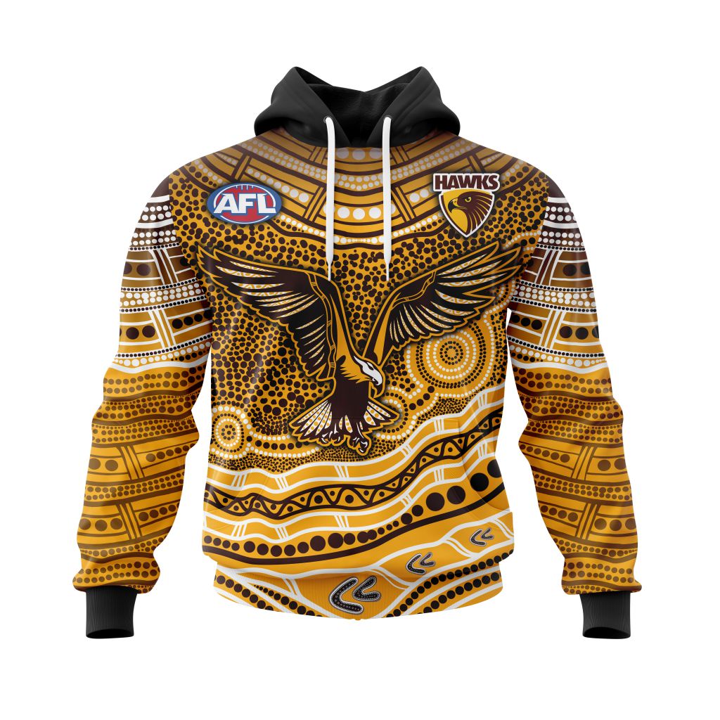 AFL Hawthorn Hawks Custom Name Number Indigenous Mascot Pullover Hoodie Product Features Along with its Hawthorn Hawks graphics, this cozy pullover hoodie features super-soft midweight material. Material: 95% polyester + 5% spandex. The fabric is durable and resistant to wrinkles, shrinking and mildew. Hood with drawstrings. Long sleeve. Front pouch pocket. Midweight hoodie suitable for...