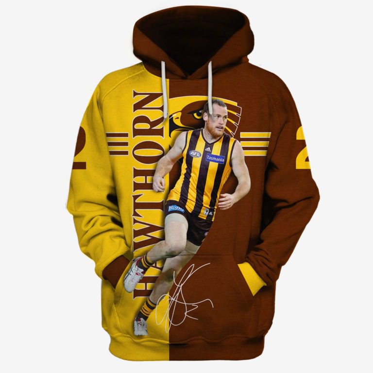 AFL Hawthorn Hawks Jarryd Roughead #2 Pullover Hoodie Product Features Along with its Hawthorn Hawks graphics, this cozy pullover hoodie features super-soft midweight material. Material: 95% polyester + 5% spandex. The fabric is durable and resistant to wrinkles, shrinking and mildew. Hood with drawstrings. Long sleeve. Front pouch pocket. Midweight hoodie suitable for moderate temperatures....