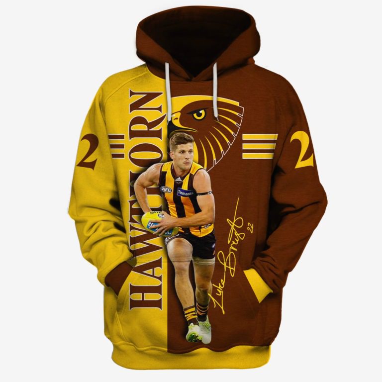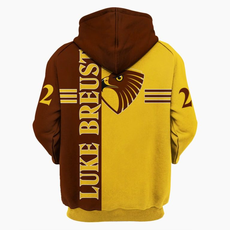 AFL Hawthorn Hawks Luke Breust #22 Pullover Hoodie Product Features Along with its Hawthorn Hawks graphics, this cozy pullover hoodie features super-soft midweight material. Material: 95% polyester + 5% spandex. The fabric is durable and resistant to wrinkles, shrinking and mildew. Hood with drawstrings. Long sleeve. Front pouch pocket. Midweight hoodie suitable for moderate temperatures....