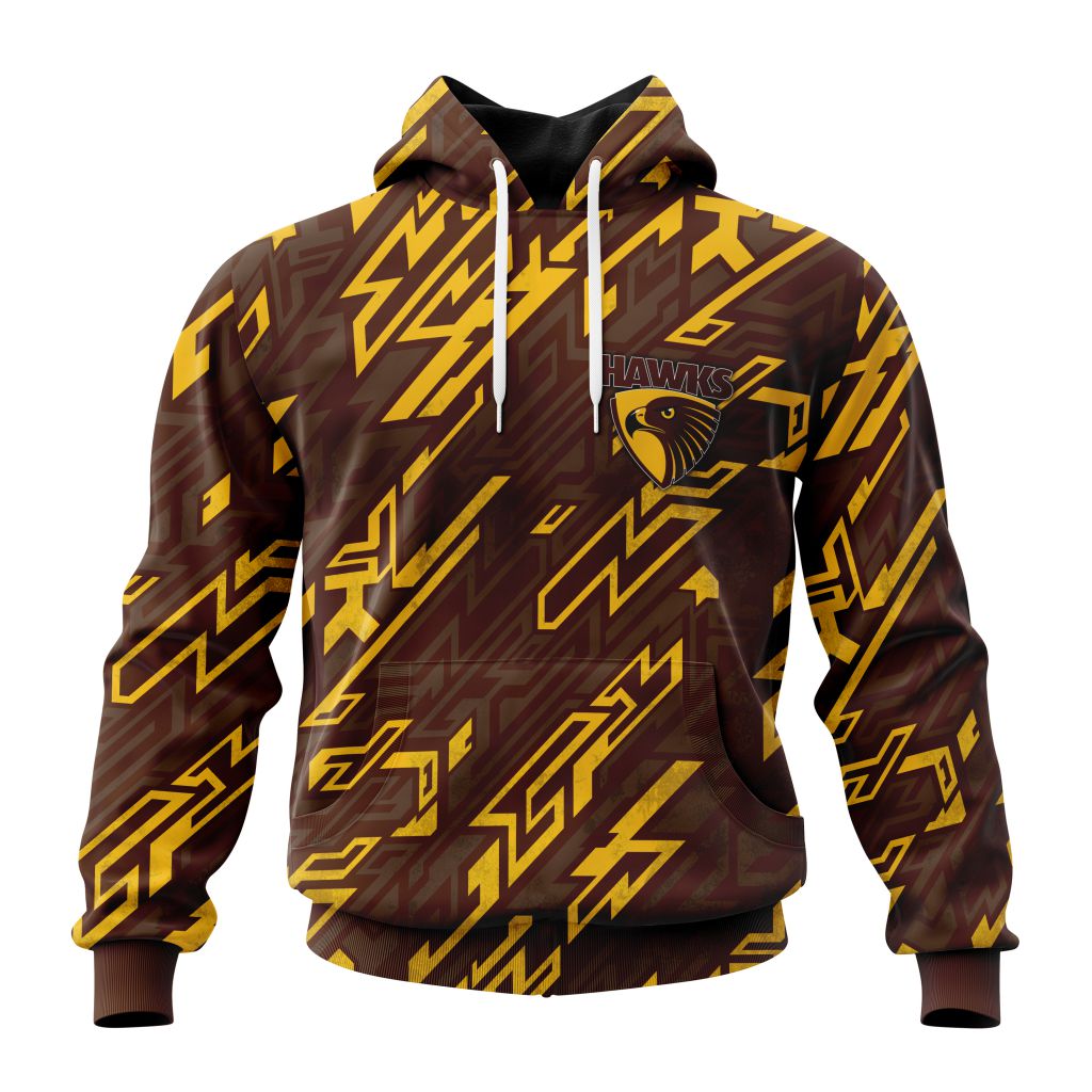 AFL Hawthorn Hawks Morden Art Style Pullover Hoodie Product Features Along with its Hawthorn Hawks graphics, this cozy pullover hoodie features super-soft midweight material. Material: 95% polyester + 5% spandex. The fabric is durable and resistant to wrinkles, shrinking and mildew. Hood with drawstrings. Long sleeve. Front pouch pocket. Midweight hoodie suitable for moderate temperatures....