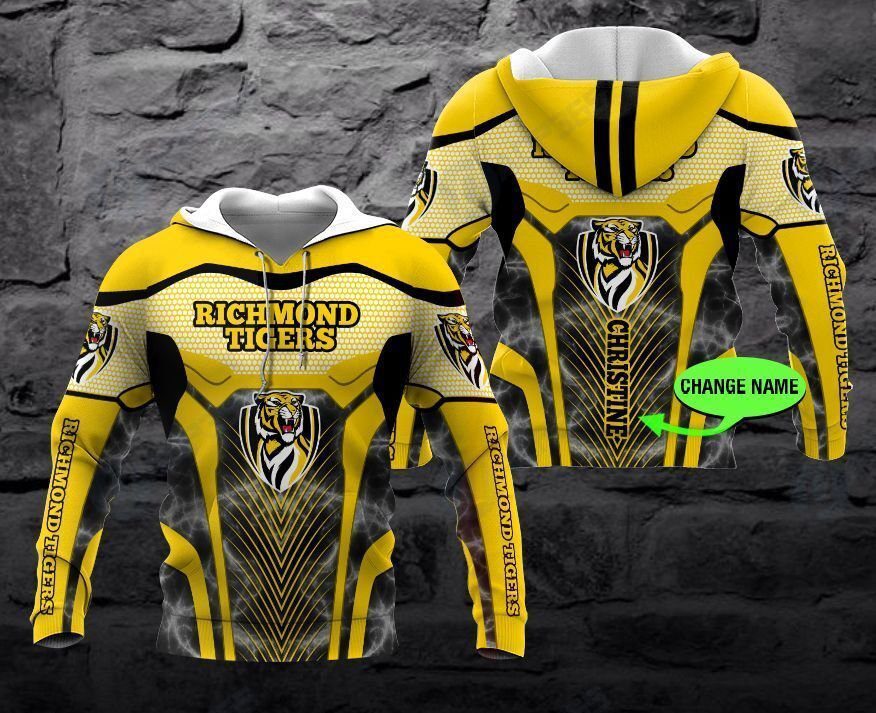 AFL Richmond Tigers Custom Name Yellow Pullover Hoodie Product Features Along with its Richmond Tigers graphics, this cozy pullover hoodie features super-soft midweight material. Material: 95% polyester + 5% spandex. The fabric is durable and resistant to wrinkles, shrinking and mildew. Hood with drawstrings. Long sleeve. Front pouch pocket. Midweight hoodie suitable for moderate temperatures....