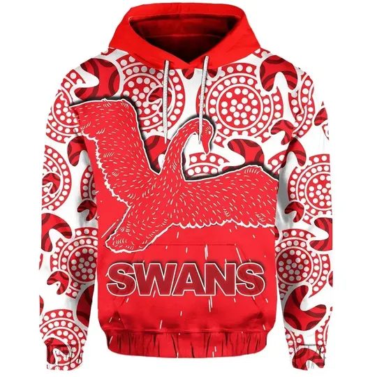 AFL Sydney Swans Aboriginal Patterns Pullover Hoodie Product Features Along with its Sydney Swans graphics, this cozy pullover hoodie features super-soft midweight material. Material: 95% polyester + 5% spandex. The fabric is durable and resistant to wrinkles, shrinking and mildew. Hood with drawstrings. Long sleeve. Front pouch pocket. Midweight hoodie suitable for moderate temperatures. Features...