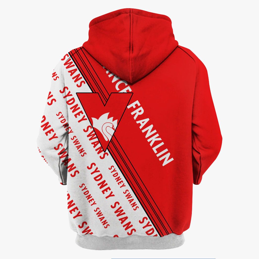 AFL Sydney Swans Lance Franklin No 23 Pullover Hoodie V2 Product Features Along with its Sydney Swans graphics, this cozy pullover hoodie features super-soft midweight material. Material: 95% polyester + 5% spandex. The fabric is durable and resistant to wrinkles, shrinking and mildew. Hood with drawstrings. Long sleeve. Front pouch pocket. Midweight hoodie suitable for...