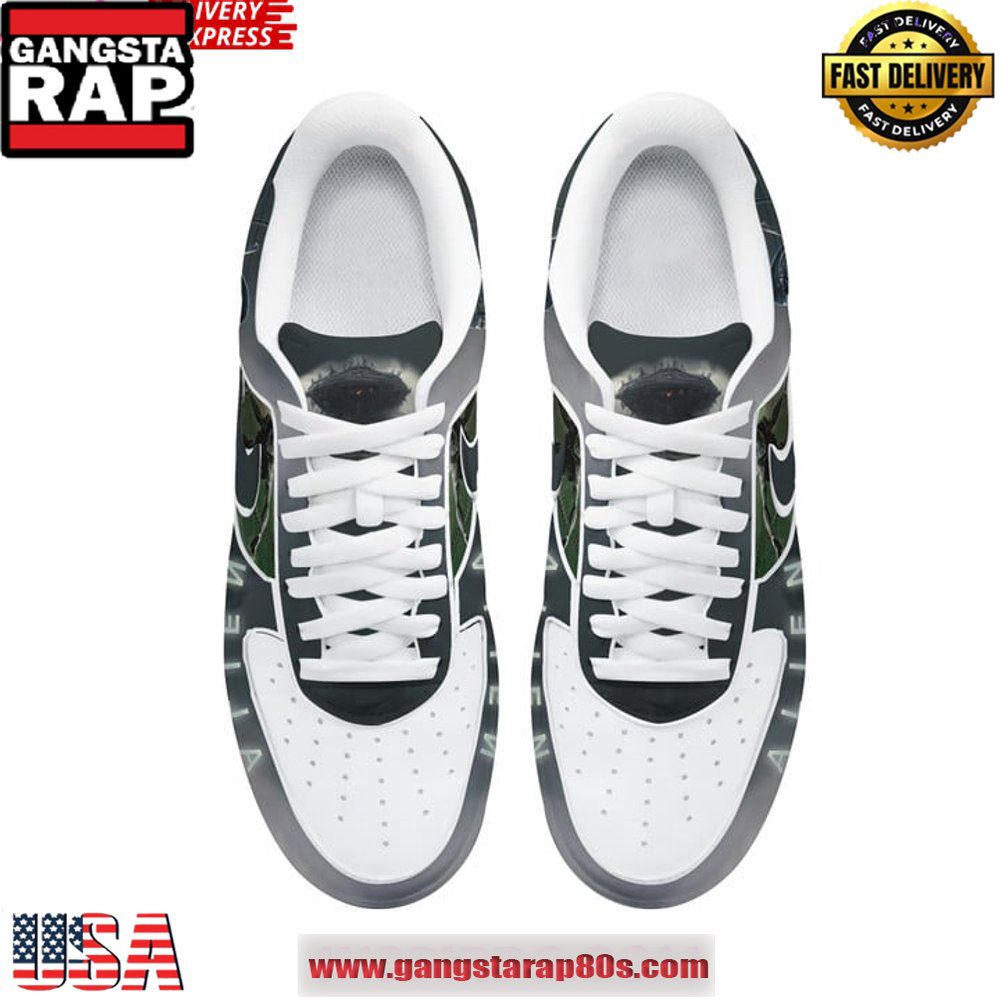 Introducing the Alien Convenant Limited Edition Air Force 1 Running Sneakers, an exclusive blend of futuristic design and iconic style that appeals to sneaker enthusiasts and fashion-forward individuals alike. Released in 2023, these Nike Air Force 1 sneakers celebrate the intersection of cinema and streetwear with a nod to the iconic “Alien” movie franchise. Perfect for those who want to make an impression, the sneakers are not just footwear; they’re a statement piece.