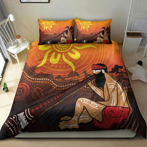 Australia Aboriginal Inspired Bedding Set Man Playing A Didgeridoo Landscape With Uluru Sunset