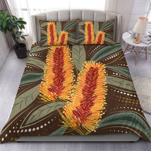 Australia Flowers Aboriginal Bedding Set – Aboriginal Dot Art With Yellow Banksia Flower Bedding Set