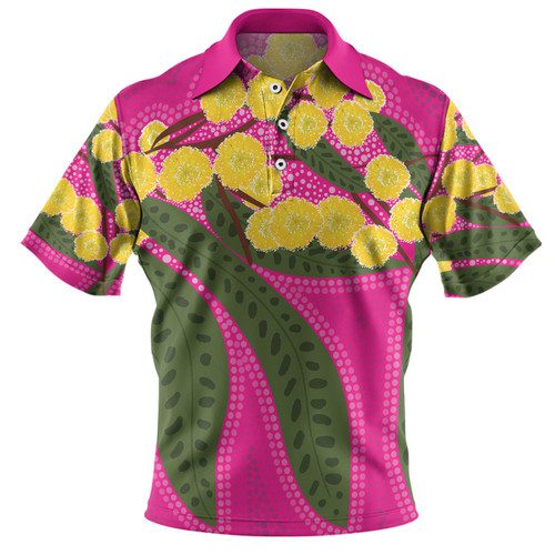 Australia Flowers Aboriginal Polo Shirt – Australian Yellow Wattle Flowers Painting In Aboriginal Dot Art Style Polo Shirt