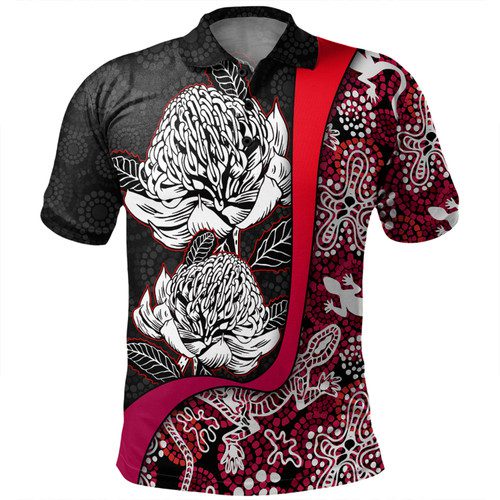 Australia Warratah Goanna Aboriginal Polo Shirt – Waratah Flowers With Red Lizards, Stones, Sand Dot Art Painting Inspired Polo Shirt