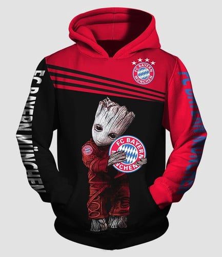 Bayern Munich Red Black Baby Groot Pullover Hoodie Product Features Along with its Bayern Munich graphics, this cozy pullover hoodie features super-soft midweight material. Material: 95% polyester + 5% spandex. The fabric is durable and resistant to wrinkles, shrinking and mildew. Hood with drawstrings. Long sleeve. Front pouch pocket. Midweight hoodie suitable for moderate temperatures....