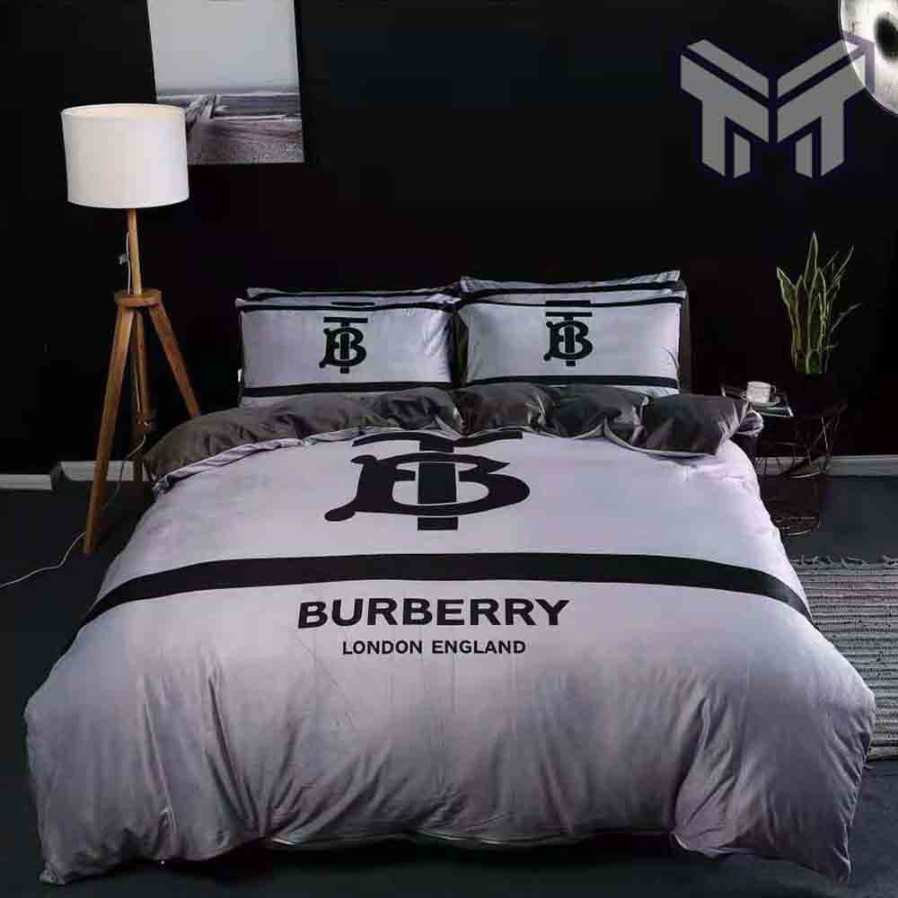 Burberry Bedding Sets, Burberry Grey Luxury Logo Fashion Brand Premium Bedding Set Home Decor Information: