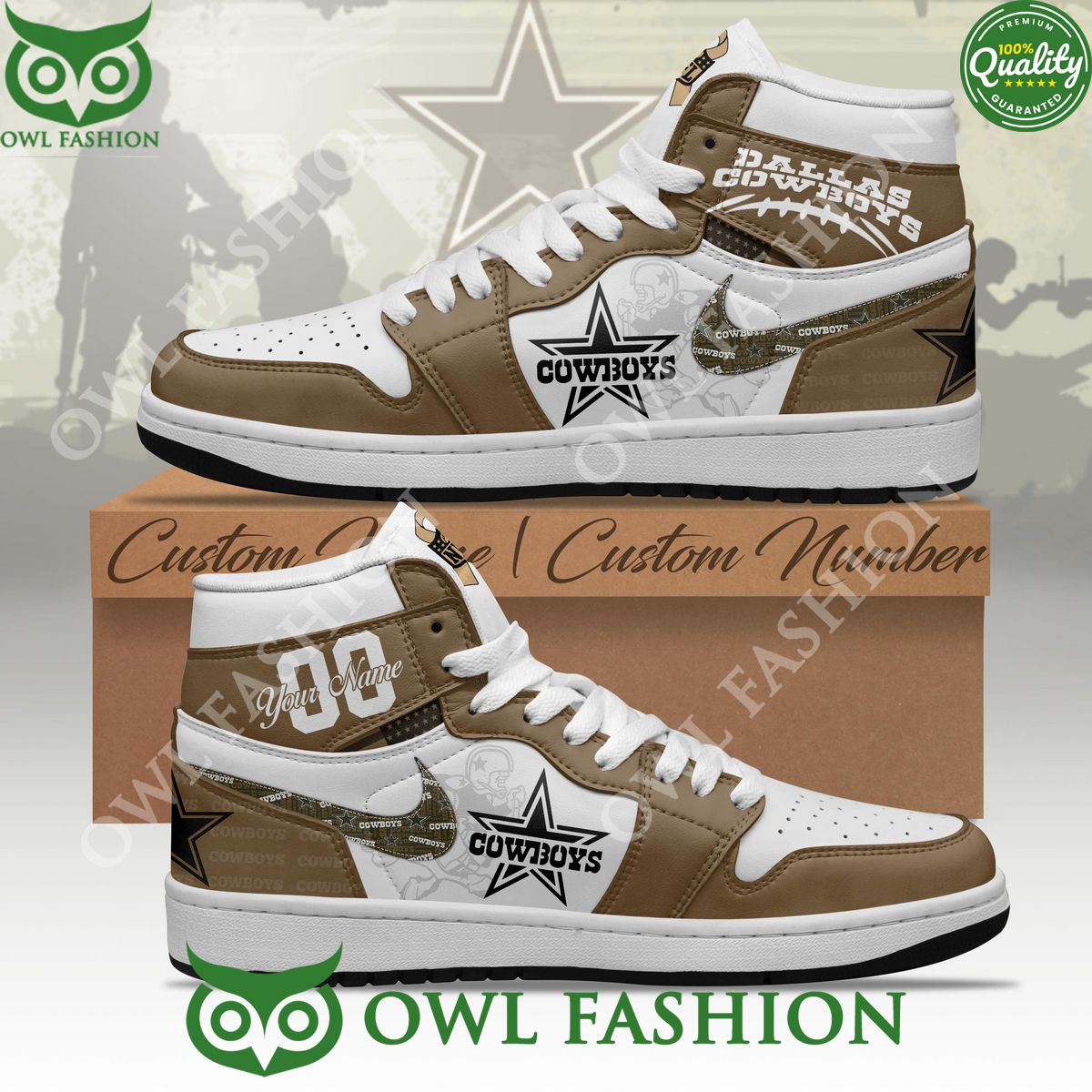 In conclusion, the Camouflage Dallas Cowboys NFL Veterans Air Jordan High Top Shoes Limited are more than just footwear; they’re a wearable celebration of sports culture, urban style, and a nod to the brave individuals who have served in the military. Whether you’re a die-hard Cowboys fan, a sneaker collector, or someone who appreciates unique design elements, these limited edition kicks offer a stylish and meaningful way to showcase your team pride. Lace-up, stand tall, and let your love for the Dallas Cowboys shine with every step.