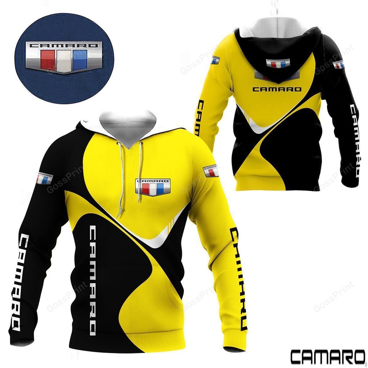 Chevrolet Camaro Yellow Pullover Hoodie Product Features Along with its Chevrolet Camaro graphics, this cozy pullover hoodie features super-soft midweight material. Material: 95% polyester + 5% spandex. The fabric is durable and resistant to wrinkles, shrinking and mildew. Hood with drawstrings. Long sleeve. Front pouch pocket. Midweight hoodie suitable for moderate temperatures. Features a specialty...