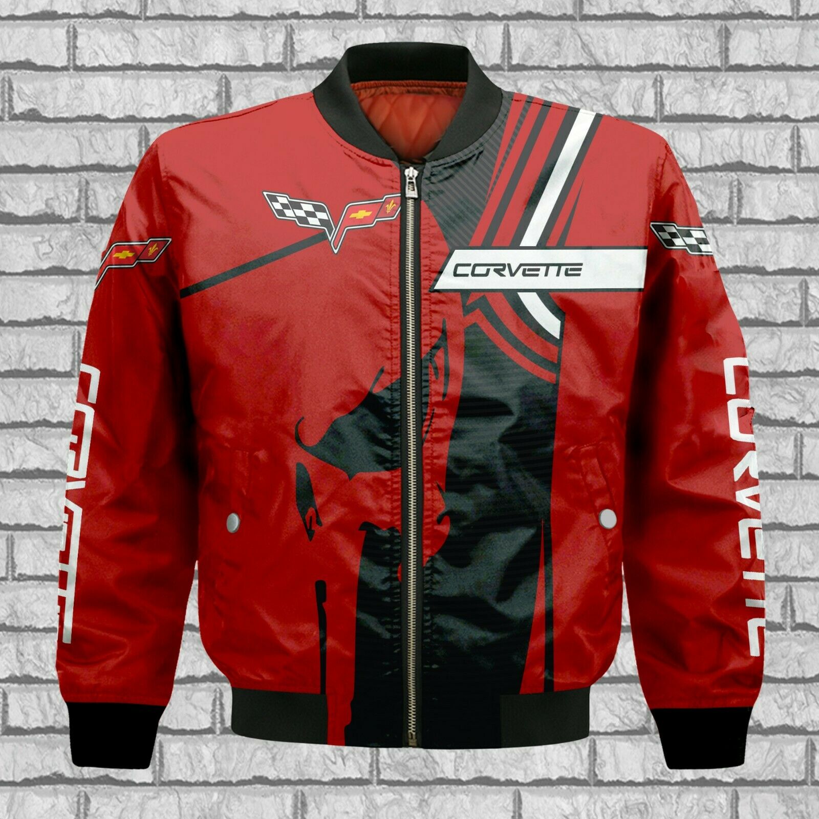 Chevrolet Corvette Red Skull Bomber Jacket Product Features This sweet bomber jacket features crisp Chevrolet Corvette graphics that put your fandom proudly on display, so no one will be able to question your allegiance. Always on-trend: Matches seamlessly with anything underneath ? definitely a wardrobe staple. Comfy & warm: With ample lining inside, this jacket...