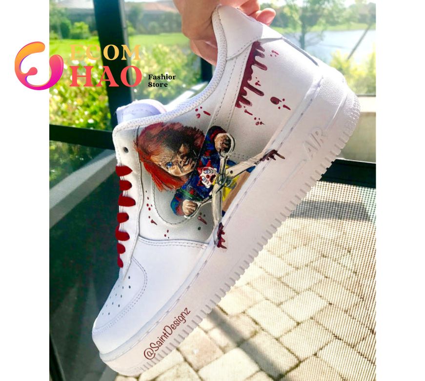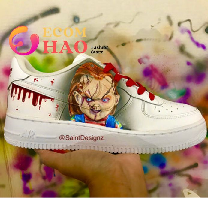Chucky Air Force 1 Custom The Chucky Air Force 1 Custom is a perfect option for anyone looking to add a stylish new look to their sneaker collection. These custom shoes come in an array of colors, from a bold orange to a tranquil sky blue, and offer a unique design featuring both Chucky motifs...