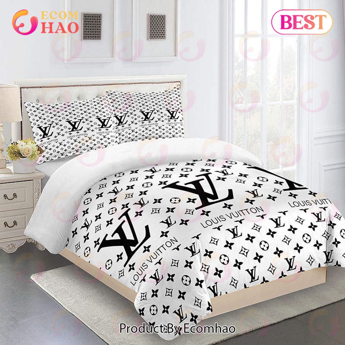 Comforter Sets Golden With And Black Logo Louis Vuitton Bedding Set Home Decoration This luxury comforter set from Louis Vuitton is made from a quality material and crafted with high levels of detail and craftsmanship. The black and golden logo of the brand make it a luxurious addition to any room. It has a polyester...