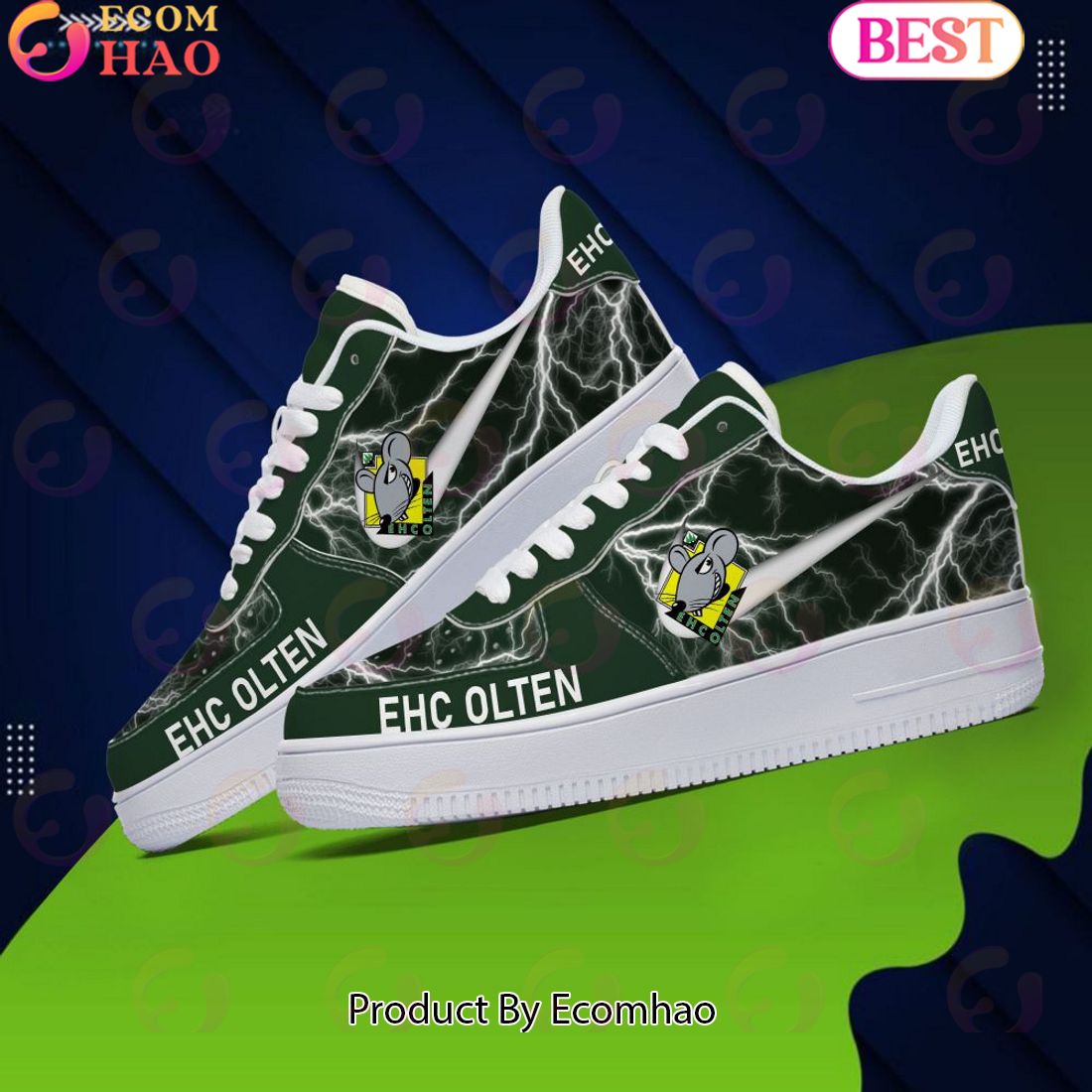 EHC Olten Thunder Design Air Force 1 The EHC Olten Thunder Design Air Force 1 shoe is a fashionable sneaker designed with comfort and style in mind. Featuring the embroidered EHC Olten Thunder team logo on the side and the signature Nike Air Force 1 midsole for plush cushioning, this shoe is perfect for everyday...