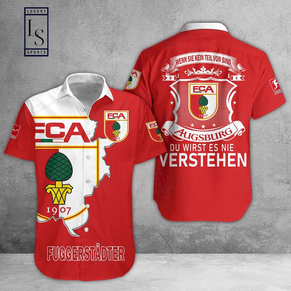 Perfect for warm days and for holidays. This shirt feels absolutely wonderful, like a second layer of skin! The print will remain vibrant over time and won?t easily wear down. This FC Augsburg Hawaiian Shirt lasts wash after wash, without becoming wrinkled or damaged. This short-sleeved design gives your arms optimal comfort and mobility — perfect for summertime.