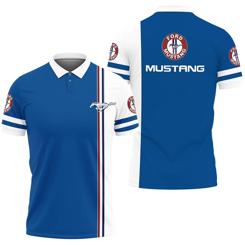 Ford Mustang Blue White Split Polo Shirt Product Features Versatile and fitting numerous styles, this Ford Mustang polo shirt can deliver a simple yet mature look, or a fresh and sporty vibe, it?s up to you! Comfortable and made of 95% polyester + 5% spandex, this shirt absorbs extra moisture with ease – perfect for...