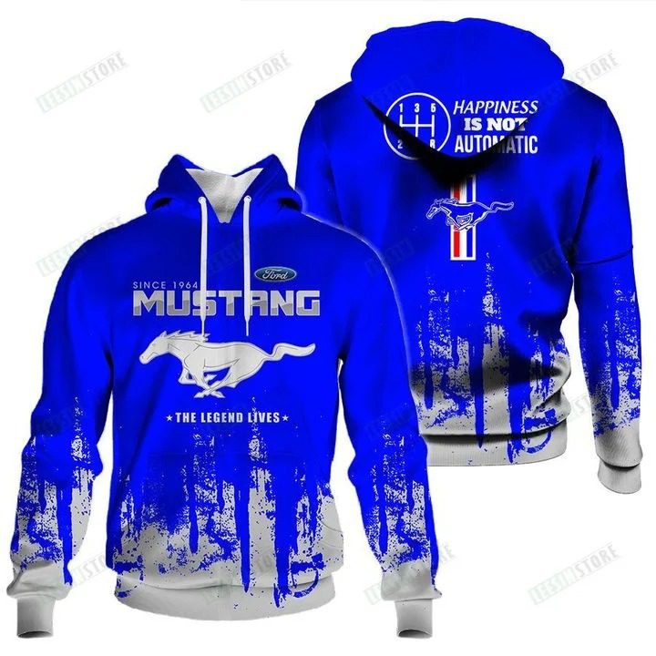 Ford Mustang The Legend Lives Happiness Is Not Automatic Pullover Hoodie Product Features Along with its Ford Mustang graphics, this cozy pullover hoodie features super-soft midweight material. Material: 95% polyester + 5% spandex. The fabric is durable and resistant to wrinkles, shrinking and mildew. Hood with drawstrings. Long sleeve. Front pouch pocket. Midweight hoodie suitable...