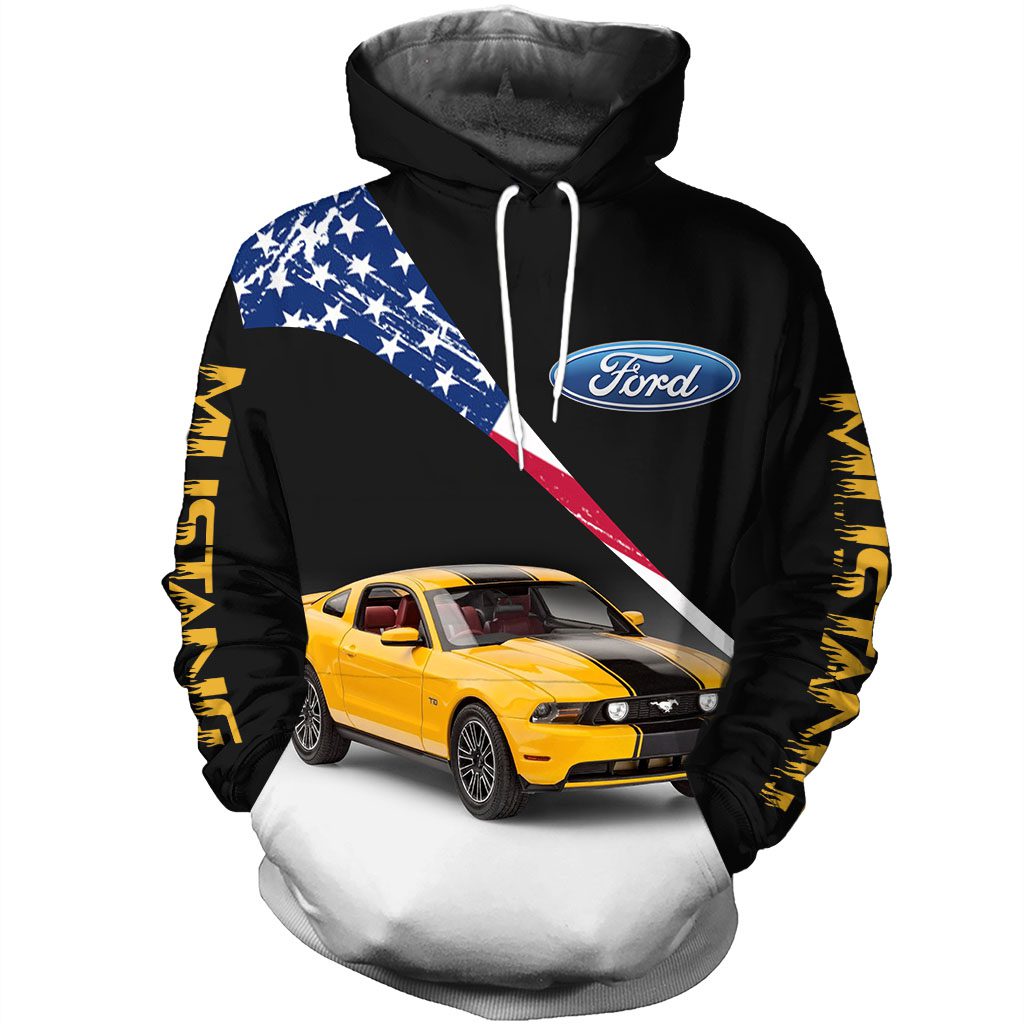 Ford Mustang Yellow Car Pullover Hoodie Product Features Along with its Ford Mustang graphics, this cozy pullover hoodie features super-soft midweight material. Material: 95% polyester + 5% spandex. The fabric is durable and resistant to wrinkles, shrinking and mildew. Hood with drawstrings. Long sleeve. Front pouch pocket. Midweight hoodie suitable for moderate temperatures. Features a...