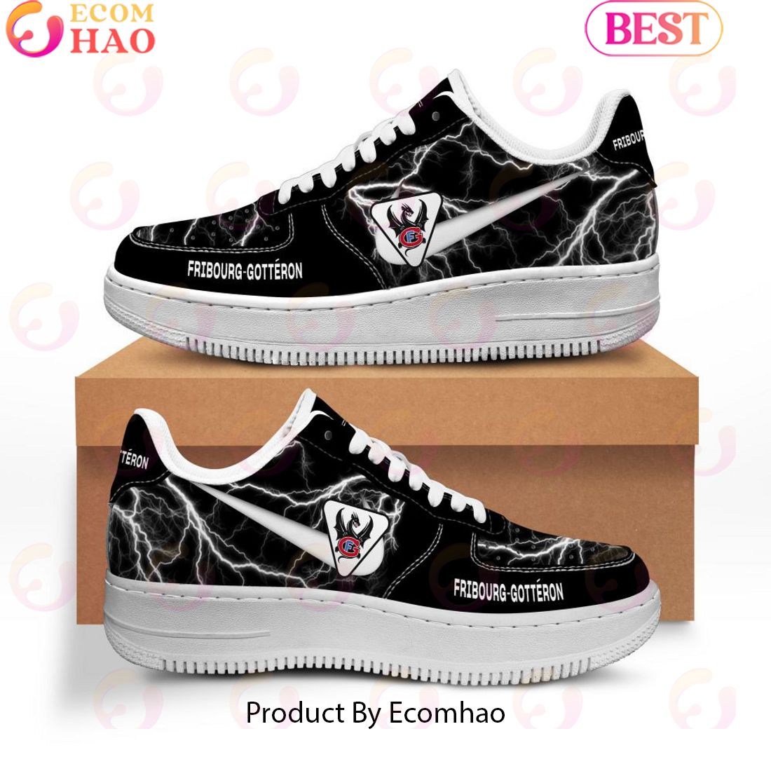 The Fribourg-Gotteron Thunder Design Air Force 1 is a great choice for anyone looking for a sleek and stylish shoe. This shoe has a unique design, featuring a black and gray color palette with an abstract pattern on the side. The upper is made from genuine leather which ensures durability, breathability, and comfort. The Air Force 1 also features the classic Air Force 1 silhouette, as well as a hidden lacing system which provides more stability and support. The rubber sole provides excellent traction and shock absorption, while the padded midsole keeps your feet comfortable and protected during workouts or any other activity. With a classy and modern look, the Fribourg-Gotteron Thunder Design Air Force 1 is sure to turn heads wherever you go.