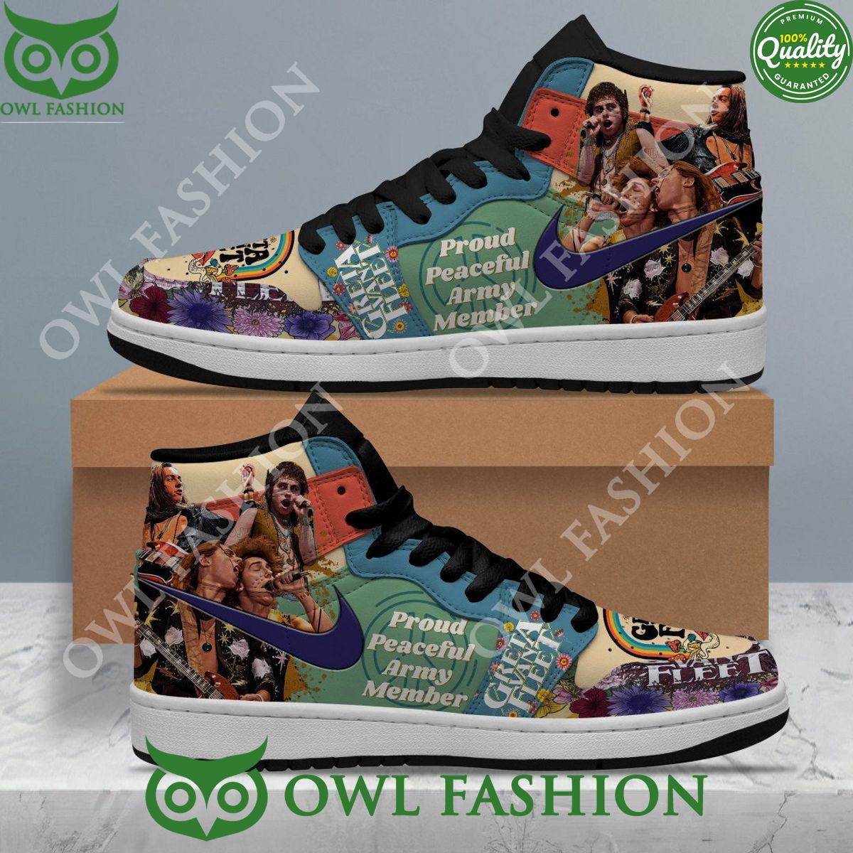 Available in various sizes, the Greta Van Fleet Rock Band Innings Festival Printed Air Jordan High Top Sneakers cater to fans of all ages who want to elevate their footwear game with a touch of rock-inspired flair. Whether you’re a long-time fan of Greta Van Fleet or just discovering their music, these sneakers are a stylish ode to the band’s influence on the rock genre.