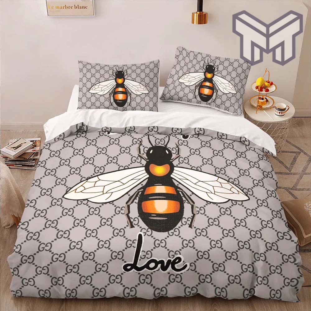 Gucci Bedding Set, Gucci Bee Blind For Love Fashion Logo Premium Luxury Brand High-End Bedding Set LV Home Decor
