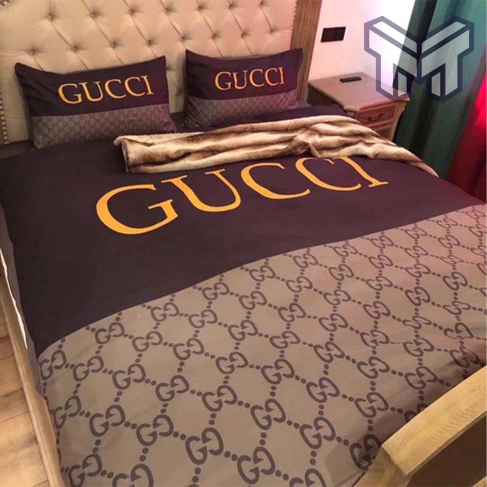 Gucci Bedding Set, Gucci Brown Beige Logo Luxury Brand Bedding Set Home Decor, The Best Quantity and Service: Introducing the Gucci Bedding Set, a perfect blend of luxury and elegance to transform your bedroom into a haven of sophistication. Immerse yourself in the opulence of the Gucci Brown Beige Logo Luxury Brand Bedding Set, a...
