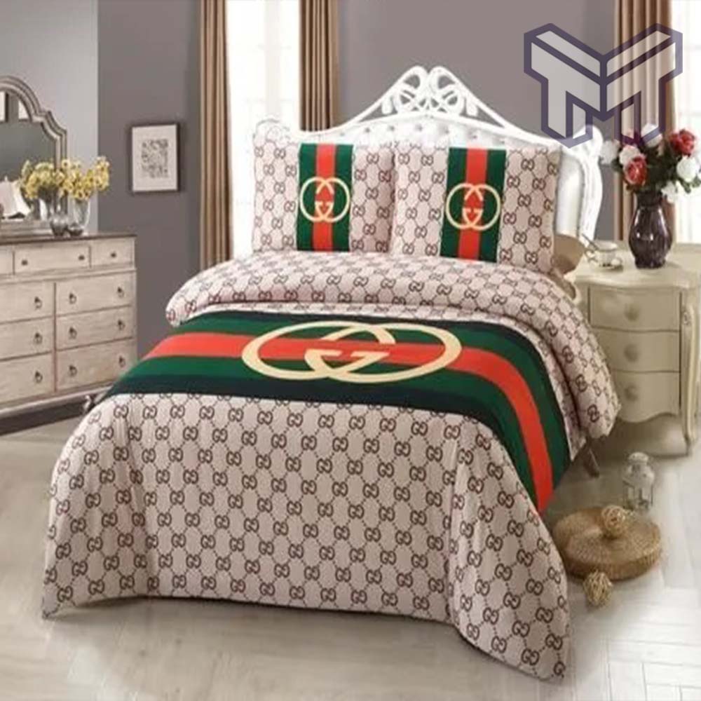 Gucci Bedding Set, Gucci Brown Stripe Luxury Brand High-End Bedding Set Home Decor, The Best Quantity and Service: