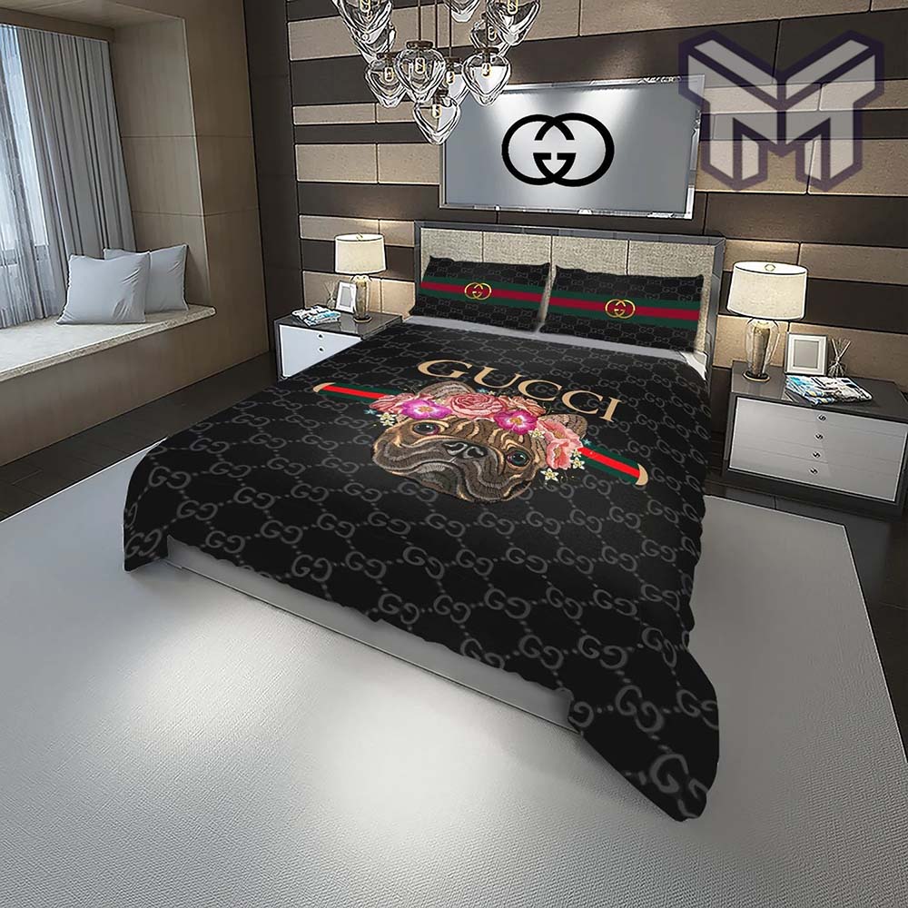 Gucci Bedding Set, Gucci Doggy And Flowers Fashion Logo Luxury Brand Premium Bedding Set Home Decor Information:
