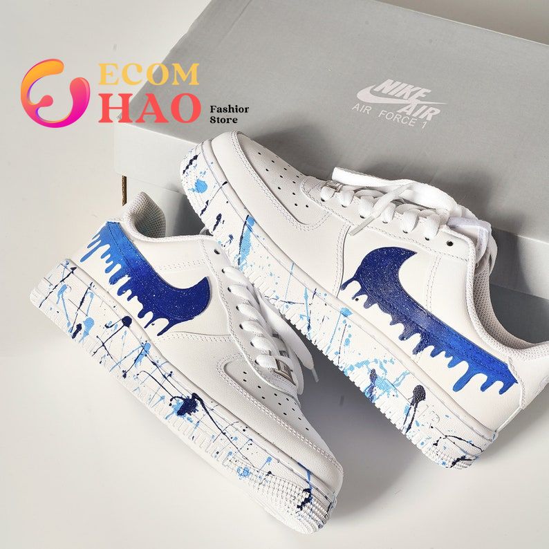 HandPainted Blue Drip Personalized Air Force 1 This stunning Nike Air Force 1 has been hand painted with a beautiful blue drip effect. The carefully crafted pattern stands out in low light, and makes a bold statement in brighter light. Each pair is personalized to the customer?s specifications. The job of personalizing the shoes is...