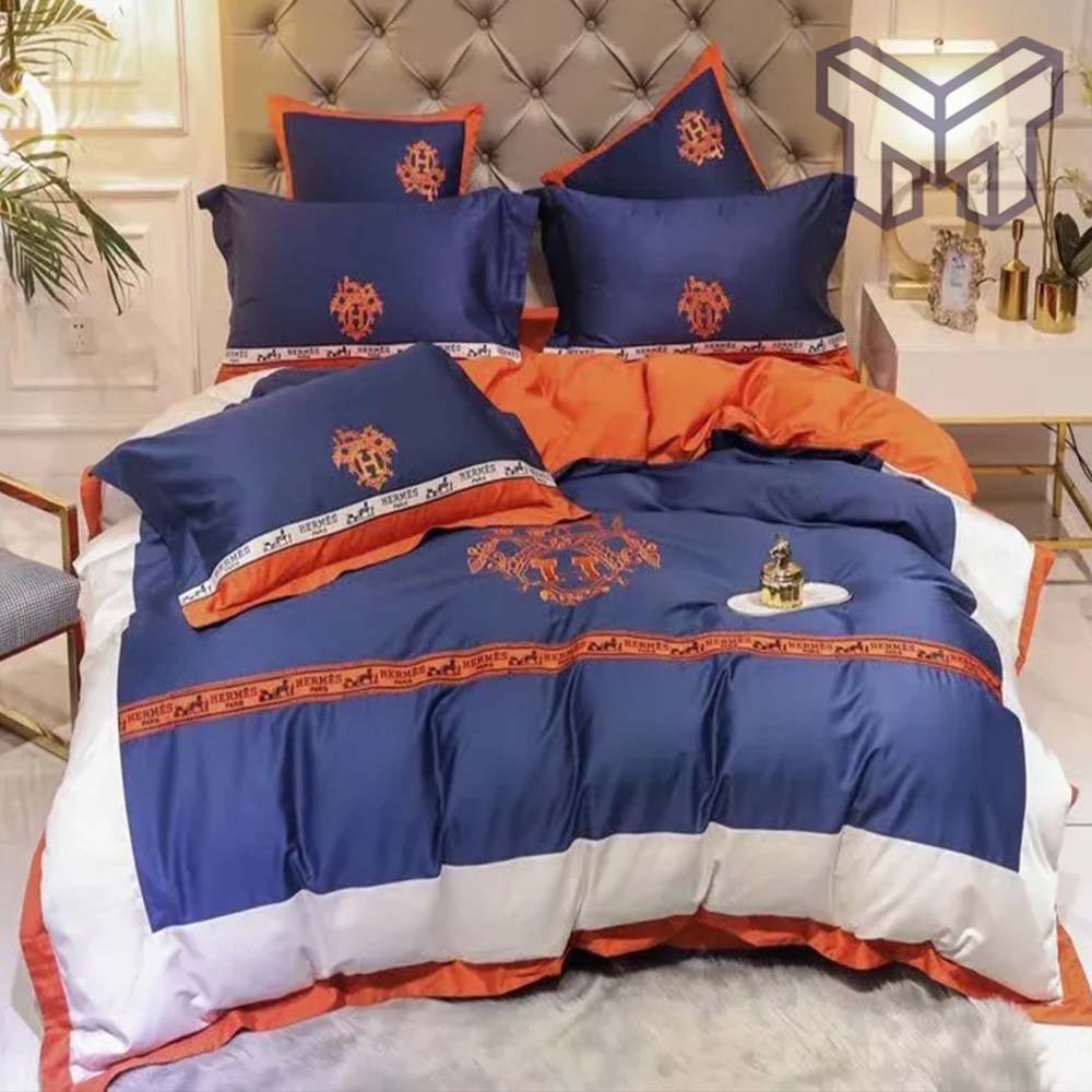 Hermes Bedding Set, Hermes Blue Logo Luxury Brand Bedding Set Duvet Cover Home Decor, The Best Quantity and Service: