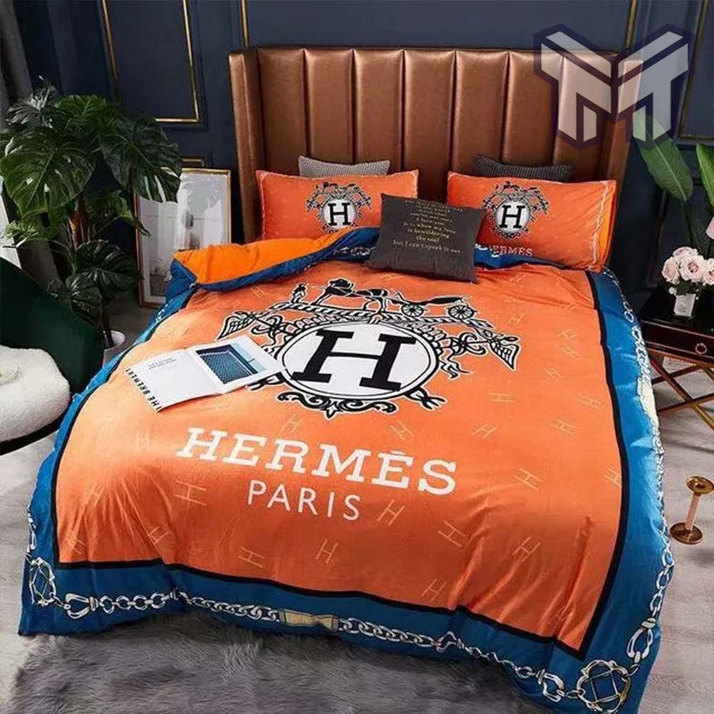 Indulge in the epitome of lavishness and sophistication with the Hot Hermes Bedding Set. This stunning ensemble is a testament to the renowned luxury brand Hermes, known for their impeccable style and attention to detail. The set boasts a captivating Hermes Orange color scheme, infusing your home decor with a vibrant and contemporary allure. Crafted with meticulous care, the bedding set showcases premium materials that guarantee exceptional comfort and longevity. Included in the set are a luxurious duvet cover, meticulously designed pillowcases, and an exquisite bedspread that adds an extra layer of elegance to your bedroom. Adorned with the iconic Hermes logo, this bedding set epitomizes refined opulence. Whether you’re looking to make a bold statement or create a harmonious ambiance, the Hot Hermes Bedding Set is the perfect choice for those seeking both luxury and functionality. Elevate your living space to unparalleled heights of sophistication with this exceptional Hermes bedding set, and immerse yourself in the lap of luxury every night.