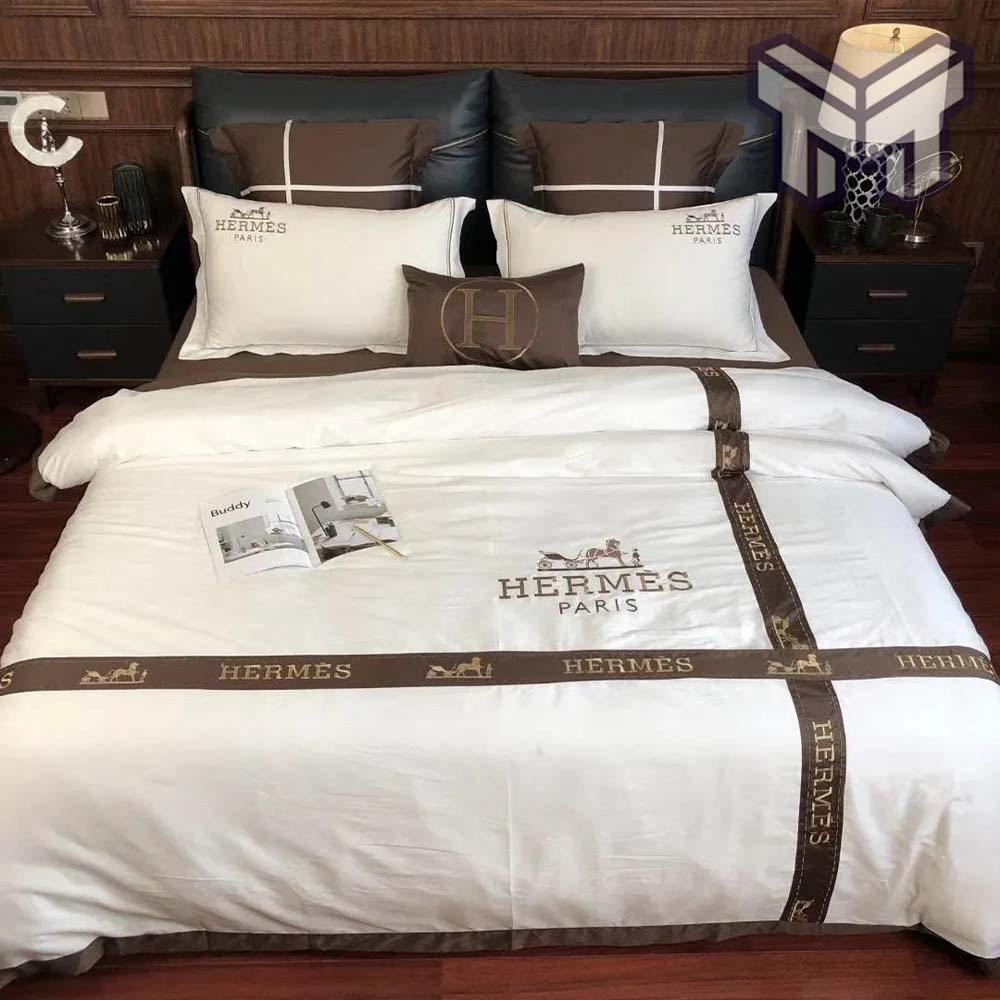 Hermes Bedding Set, Hermes White Brown Luxury Brand Premium Bedding Set Duvet Cover Home Decor, The Best Quantity and Service: The Hot Hermes Bedding Set in an exquisite combination of white and brown is a true embodiment of luxury and sophistication, making it a captivating choice for those seeking to elevate their bedroom decor. This...