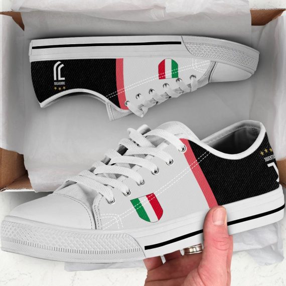 Product Features Put your best foot forward with these Juventus FC low top shoes, you can now look the part of the #1 fan from head to toe. Full canvas double sided print with rounded toe construction. Lace-up closure for a snug fit. Designed for both men and women. Metal eyelets for a classic look....