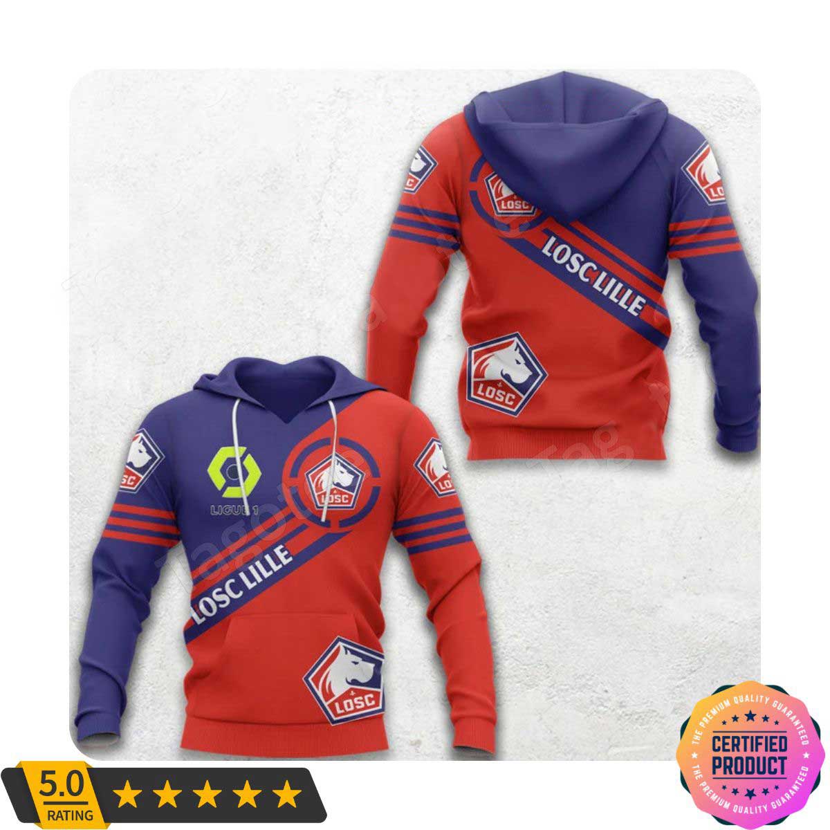 LOSC Lille Ligue 1 Blue Red Pullover Hoodie Product Features Along with its LOSC Lille graphics, this cozy pullover hoodie features super-soft midweight material. Material: 95% polyester + 5% spandex. The fabric is durable and resistant to wrinkles, shrinking and mildew. Hood with drawstrings. Long sleeve. Front pouch pocket. Midweight hoodie suitable for moderate temperatures....