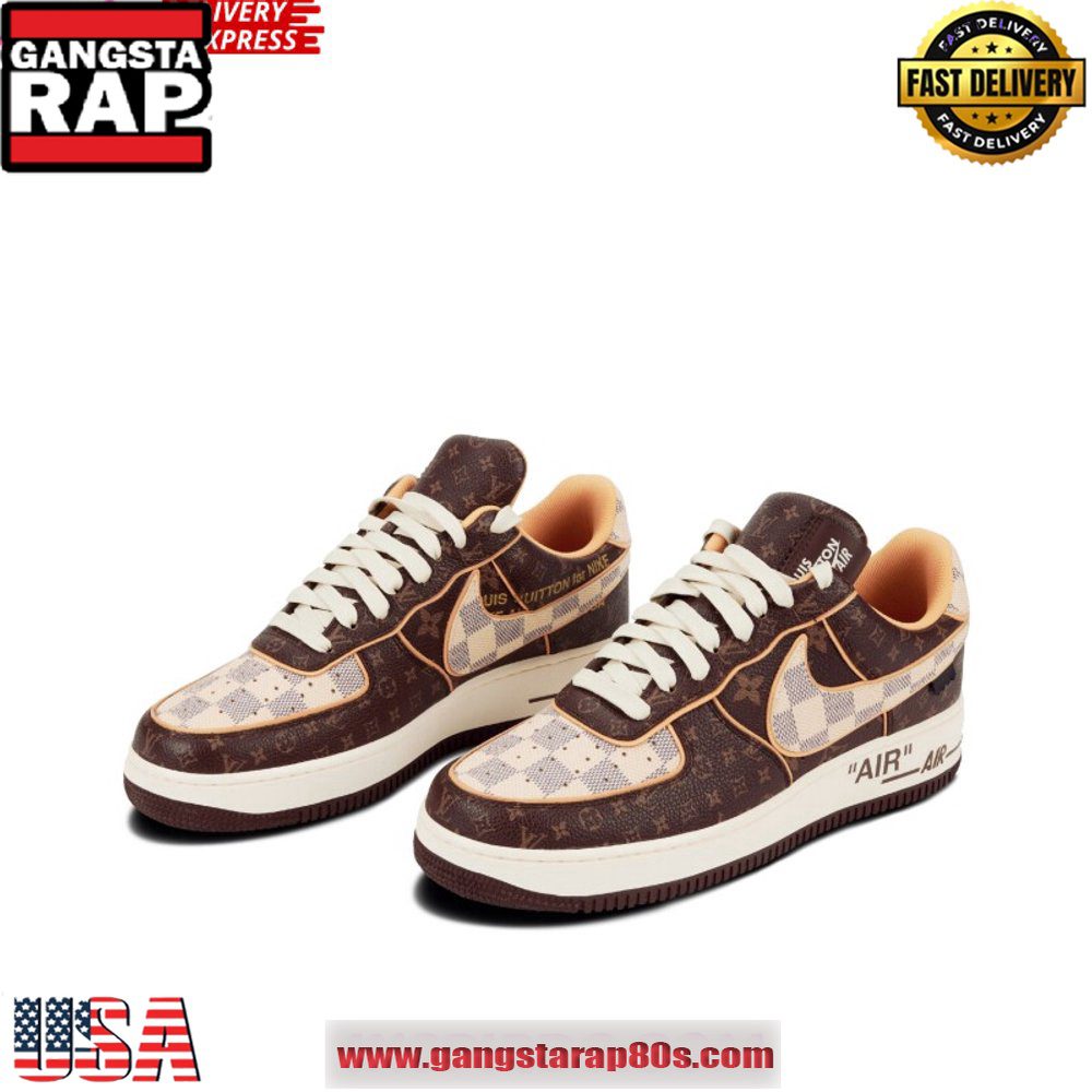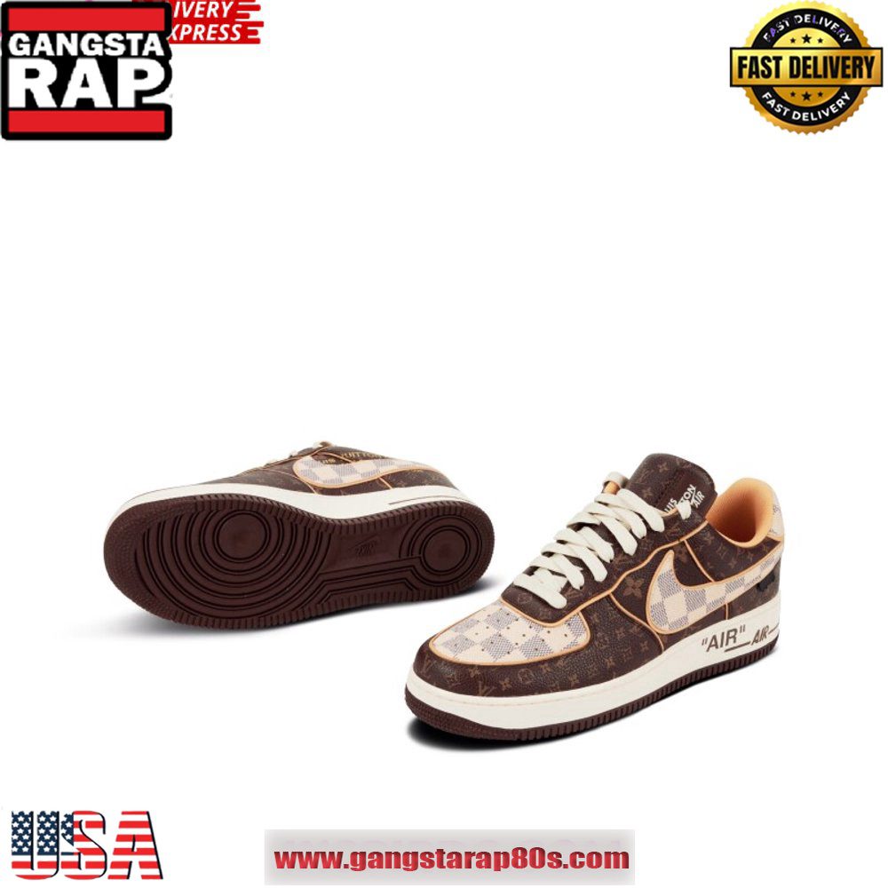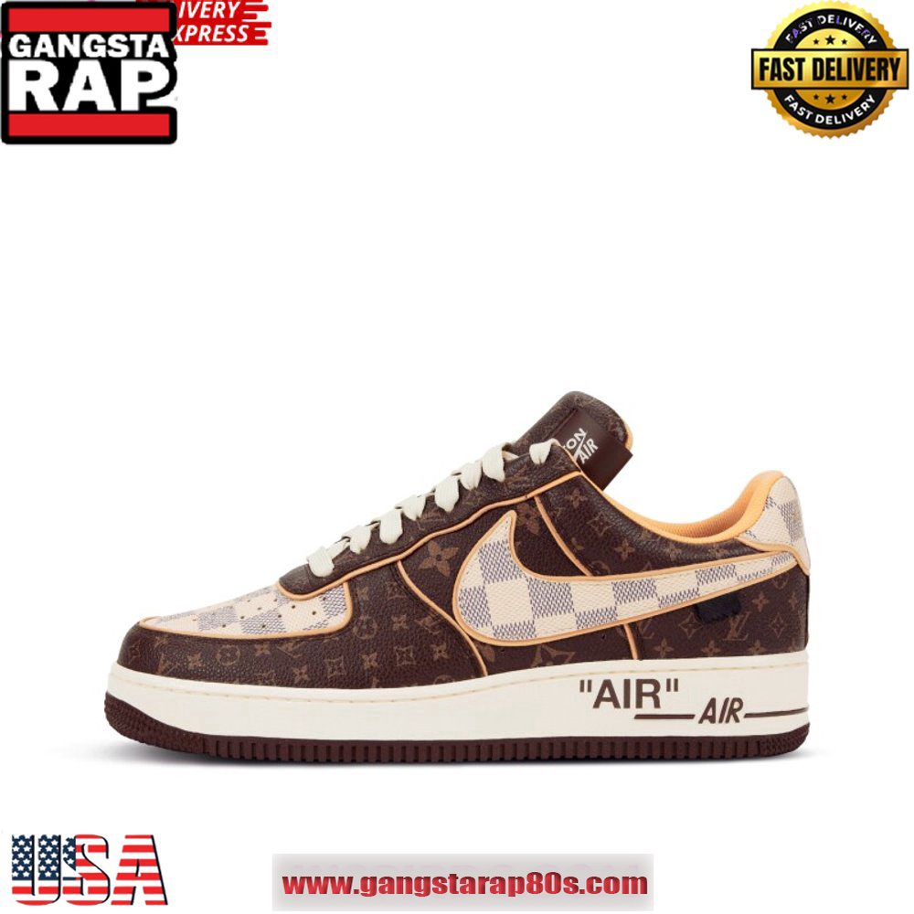 The standout design features a brown monogram pattern, highlighting Louis Vuitton’s iconic monogram on a premium leather upper. This exclusive collaboration with Nike Air Force 1 showcases a harmonious fusion of timeless elegance and urban style. The sneakers come with an impeccable craftsmanship and attention to detail, ensuring a sophisticated look that is sure to turn heads.