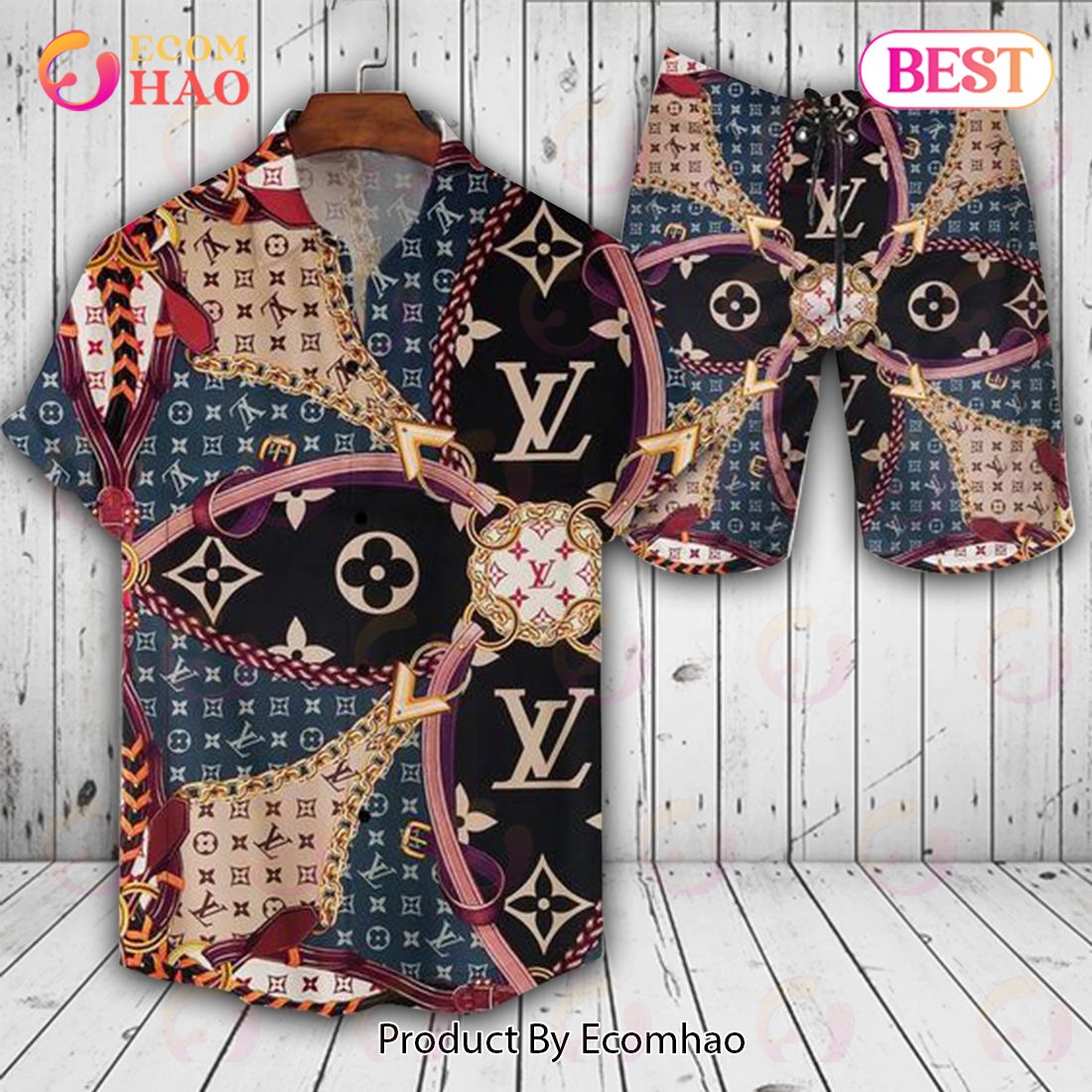 Louis Vuitton Logo Pattern Black Blue Brown LV Hawaiian Shirt And Shorts Information: