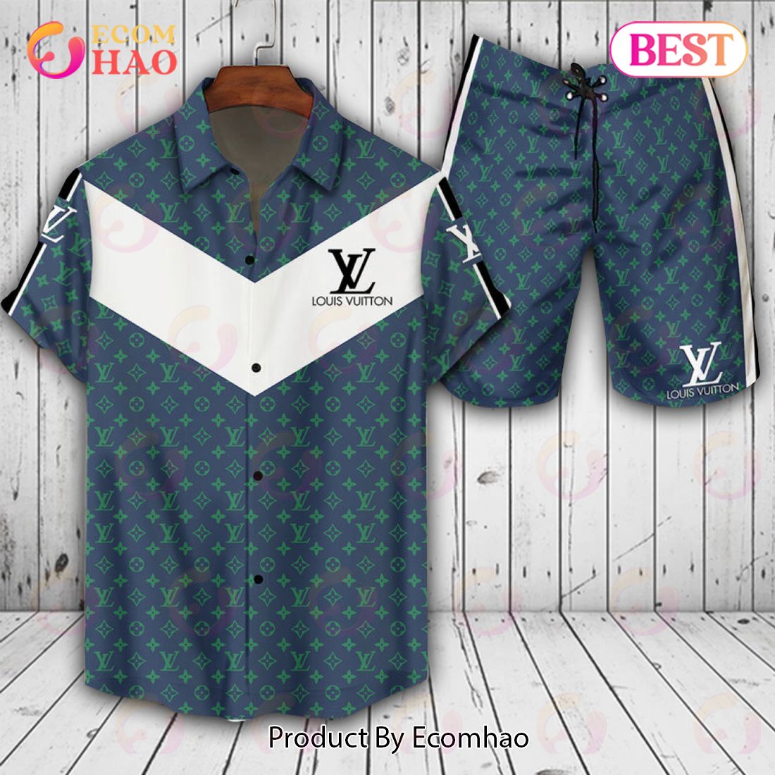 Louis Vuitton Logo Pattern White Blue LV Hawaiian Shirt And Shorts Information: