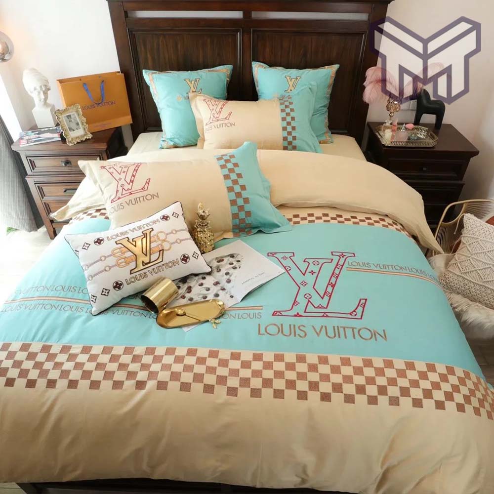 Transform your bedroom into a luxurious oasis with the Louis Vuitton Yellow Light Blue Luxury Brand Premium Bedding Set Duvet Cover Home Decor. Made from premium materials, this bedding set is designed to provide unparalleled comfort and style. The elegant yellow and light blue color palette adds a touch of sophistication to any decor scheme, while the iconic Louis Vuitton branding exudes an air of exclusivity and refinement.Crafted with care, this bedding set features intricate details that demonstrate its superior quality. From the softness of its fabric to the precise stitching on each seam, every element has been thoughtfully considered to ensure maximum comfort and durability. Whether you’re seeking a cozy night’s sleep or simply want to elevate your home decor game, this luxury bedding set is sure to exceed your expectations.Don’t settle for anything less than perfection when it comes to your bedding – choose Louis Vuitton Yellow Light Blue Luxury Brand Premium Bedding Set Duvet Cover Home Decor for a truly indulgent experience.