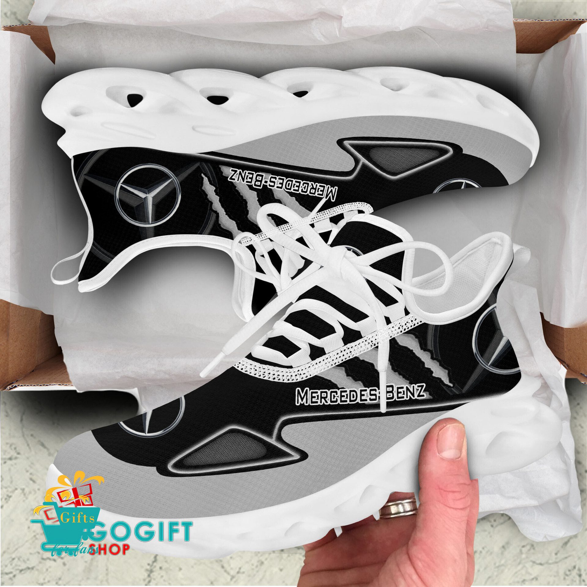 These shoes features crisp Mercedes-Benz graphics, designed for both men and women.