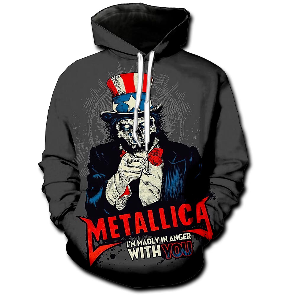 Metallica I?m Madly Anger With You Pullover Hoodie Product Features Along with its Metallica graphics, this cozy pullover hoodie features super-soft midweight material. Material: 95% polyester + 5% spandex. The fabric is durable and resistant to wrinkles, shrinking and mildew. Hood with drawstrings. Long sleeve. Front pouch pocket. Midweight hoodie suitable for moderate temperatures. Features...