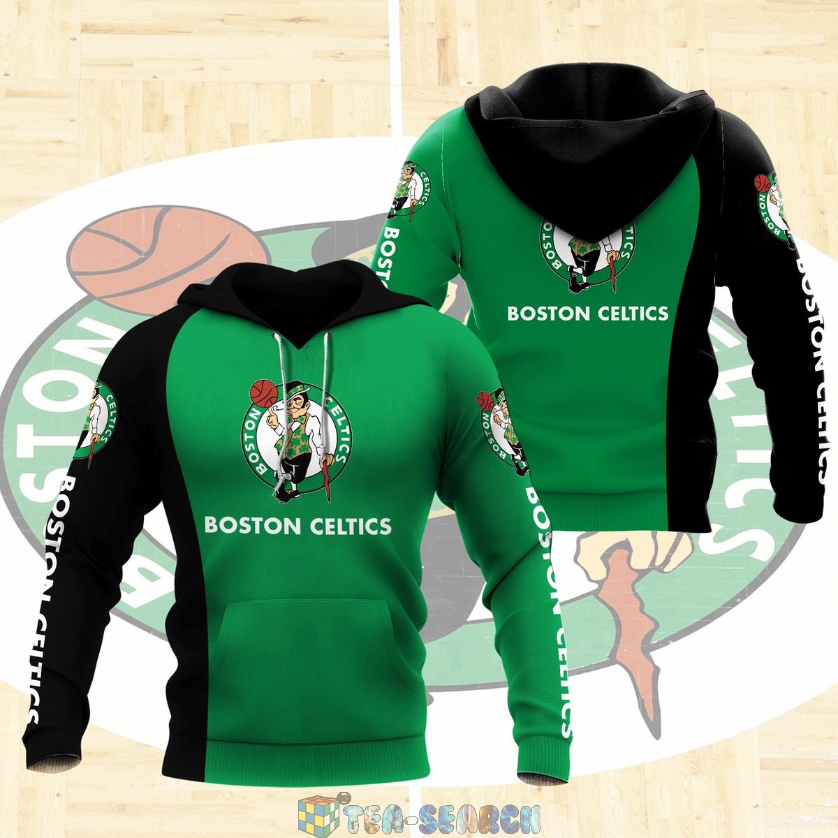 NBA Boston Celtics Green Black Pullover Hoodie V8 Product Features Along with its Boston Celtics graphics, this cozy pullover hoodie features super-soft midweight material. Material: 95% polyester + 5% spandex. The fabric is durable and resistant to wrinkles, shrinking and mildew. Hood with drawstrings. Long sleeve. Front pouch pocket. Midweight hoodie suitable for moderate temperatures....